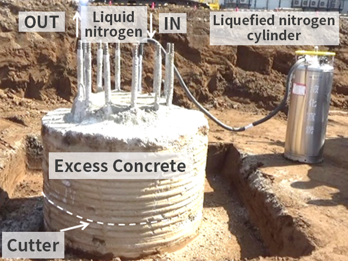 This method is based on this principle, in which refrigerated pipes are installed horizontally in a rebar cage of a cast-in-place pile in advance, and the water in these freezing pipes is frozen using liquid nitrogen, causing the freezing pipes to expand and creating horizontal cracks in excess concrete. - When the refrigeration pipes are installed at the time of rebar cage assembly, and the refrigeration pipes are cooled with liquid nitrogen after the completion of root cutting, cracks will occur about 10 minutes after the start of cooling.
