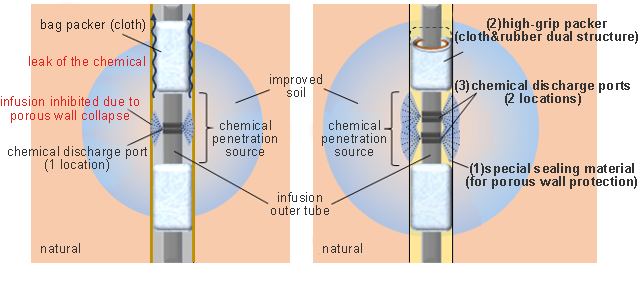 The methods can be utilized to prevent “leakage of chemical liquid from around the ground packer” and “injection inhibition of chemical liquid due to the collapse of the porous wall which is the penetration source of chemical liquid” which have been problems with the chemical grouting method of the ground packer method
