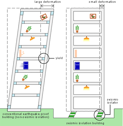 Seismic isolation devices absorb the ground motions and are greatly deformed, but they are structured so that they can support the weight of the building even if deformed.