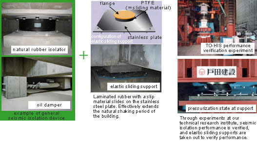 A seismic isolation system combined with elastic sliding support is used to achieve long building cycles. It is possible to make the shaking period of high-rise buildings with long natural shaking period further longer.