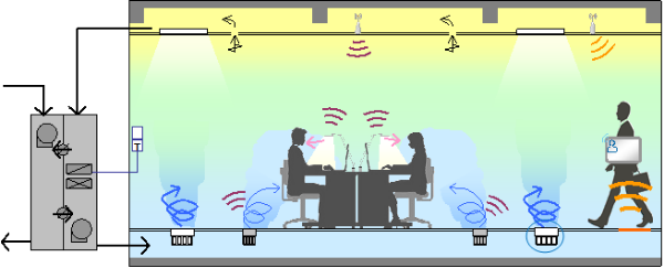The task area maintains the optimum environment when people are present, and the environment conditions are loosened in the absence of people and ambient areas to achieve both comfort and energy saving.